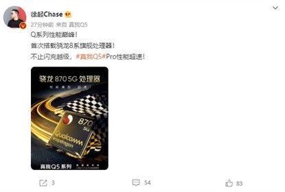 realme副总裁徐起为新机预热,将要发布的真我Q5Pro将会搭载骁龙8...