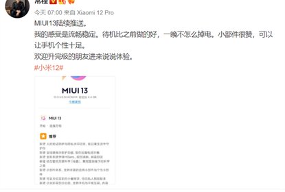 小米集团副总裁常程在微博晒图称,MIUI13开始陆续推送。事实上,...