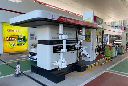 在南站西加油站现场,一辆小轿车缓缓停靠在加油机前,车主使用中...