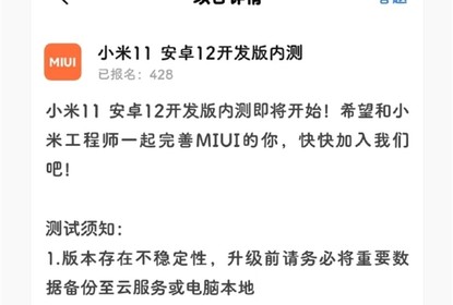 小米社区提醒,安卓12开发版存在不稳定性,参与内测的发烧友务必...