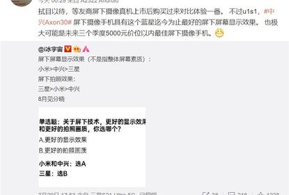 屏下屏幕显示效果中小米>中兴>三星;屏下拍照效果三星>小米>...