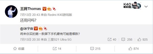 小米公司Redmi产品总监王腾、小米公司产品经理魏思琪转发微博表...