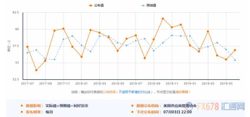 而更值得投资者注意的是,美国ISM非制造业就业指数(ISM Non- Manufacturing PMI)将在北京时间周三(7月3日)晚间22:00公布,预测值56,较前值稍有回落,在制造业就业复苏的前景下,美国的非制造业数据复苏将进一步提升投资者对于美元的信心。