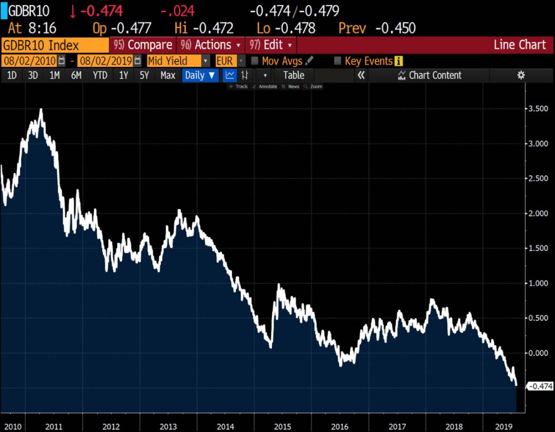 8月2日, 10年期德国国债一度跌至—0.5%。