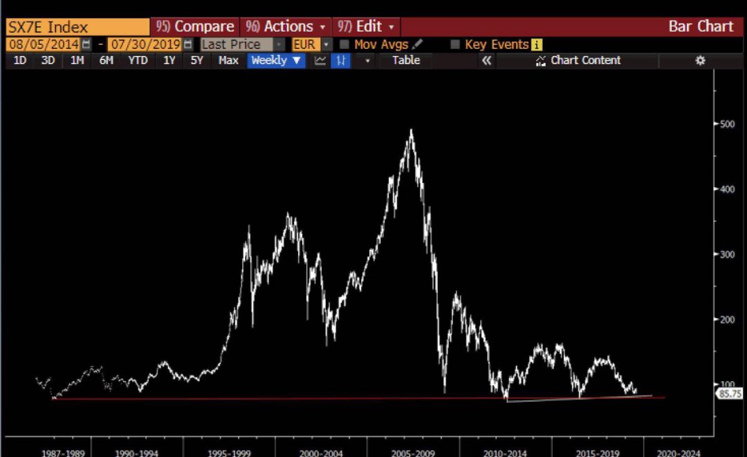 与此同时,作为以商业银行为主导的金融体系,恐慌情绪正在欧洲银行系统蔓延,8月2日欧元区斯托克银行业SX7E指数报85.75,与2012年欧债危机和2015年衰退期间基本持平。欧元区斯托克银行业STOXX 600指数中,已经有525只股票处于负收益之中。毫无疑问,在长期低利率的环境下,像商业银行和养老金等这样有长期资金配置需求的金融机构,其盈利能力必将受到严重影响。