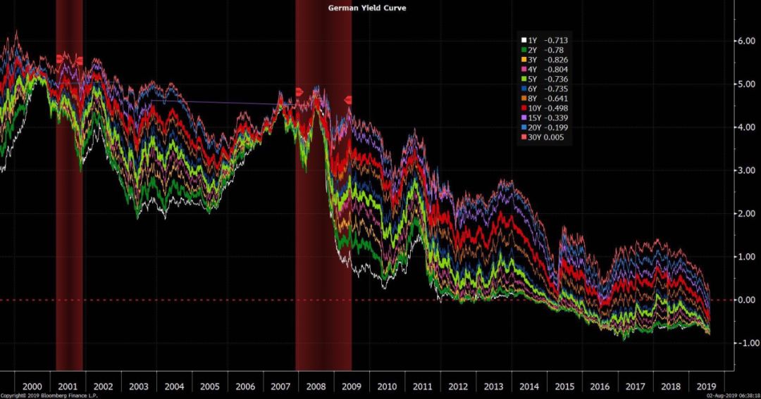 从下图来看,历史上自2000年以来,德国国债收益率曲线总体呈现下滑态势。但是在2019年,已经全面进入零利率下方,8月2日,德国30年期借款利率首次降至0%以下,成为拥有所有负收益率的最大经济体。此前,2012年6月1日是德国2年期收益率首次触及负利率, 2016年7月14日是德国10年期收益率首次出现负利率。