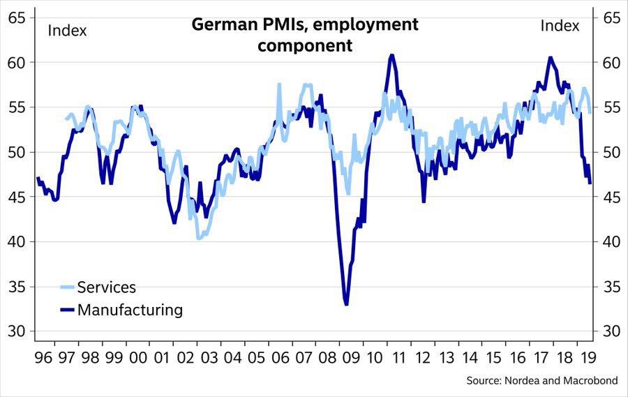 德国制造业的失血速度正在加快,但服务业仍然保持整体就业增长仍然相对积极。但是服务业和制造业之间的差距仍然巨大,预计不太可能持续很长时间。