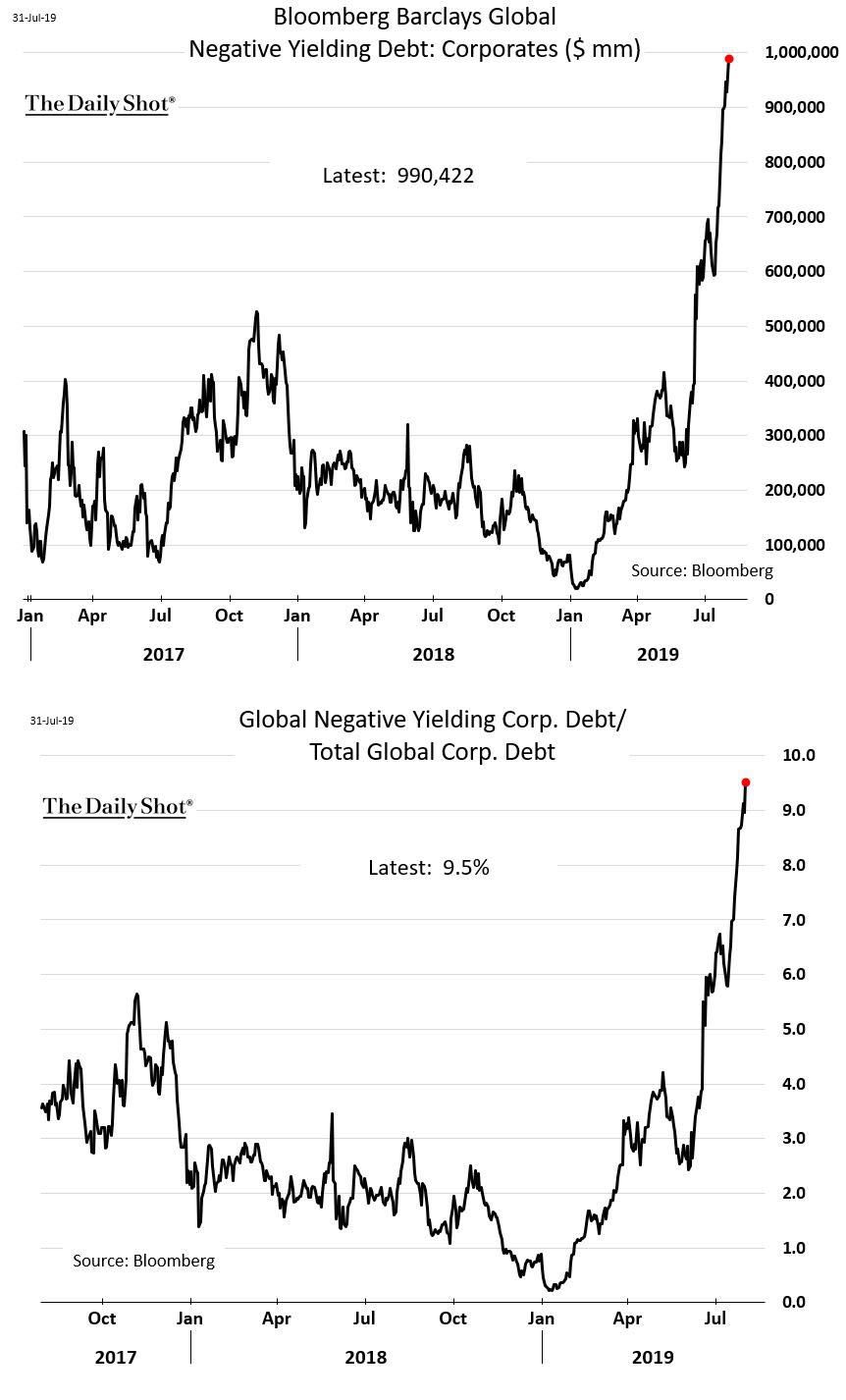 在公司债券方面,全球负收益率公司债券已经达到了1万亿美元。欧洲债券市场的投资级债券的近30%是负利率。
