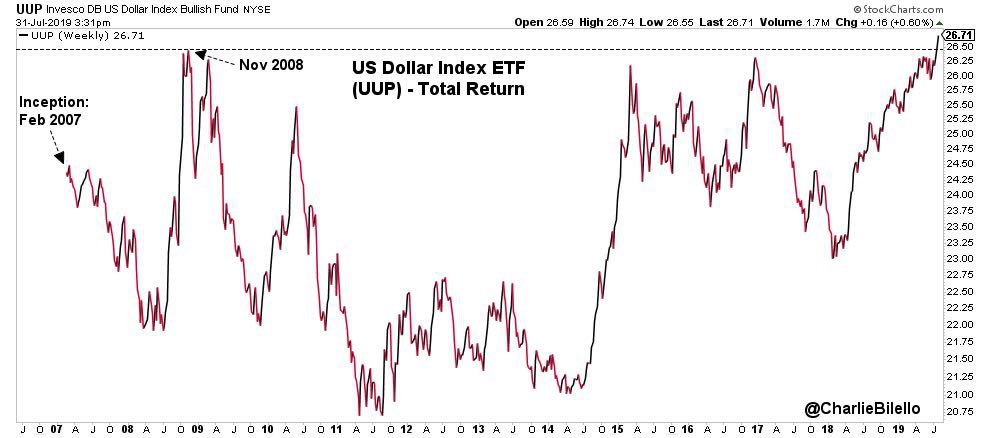 事实上,正是美国经济这种相对较好的态势,让全球资金都在纷纷涌入美元市场避险。美元指数ETF创下历史新高,超过2008年11月的前期高位。