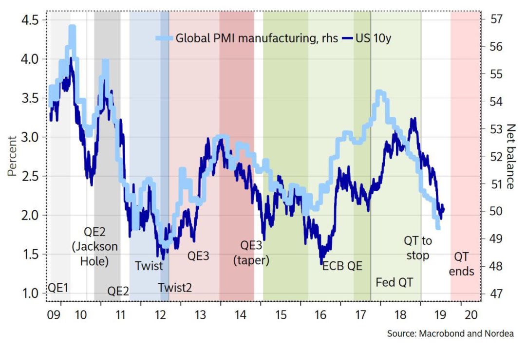 对比,美联储的降息来看,外界竟然还普遍认为,重回模糊,欲拒还迎,颇让人寻味。事实上,历史上全球制造业指数与美联储货币政策高度相关,没有那一次在全球制造业大幅回落过程中,美联储利率会高高在上。由于7月份美国制造业采购经理人指数创下自2009年9月以来最低,且ISM制造业指数创下自2016年8月以来最低,美国制造业问题也非常严重,只是消费者在时薪上涨下信心上升,拉动了总需求。