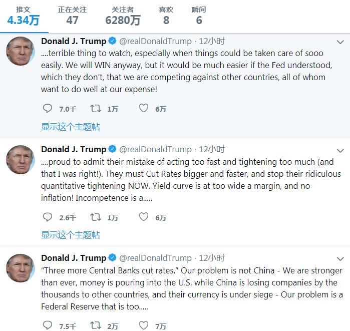 据路透社报道,特朗普在推文中表示,美联储必须“更大幅度、更快地”降息,以使美国在与其他国家的竞争中具有竞争力。
