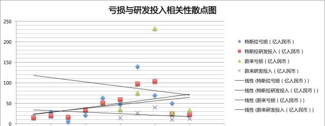 拉出特斯拉和蔚来两家公司从2011年到2019年的历年研发投入和亏损数据进行对比。数据的统计分析结果呈现出了清晰结论。