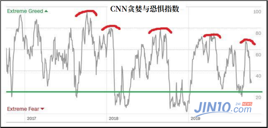 从CNN恐惧与贪婪指数的走势来看,自2017年秋季达到高峰后,该指数便逐步下跌。这似乎表明,长达10年的牛市势头正在逐渐减弱。加特曼指出,他之所以没有一早采取行动,是为了等待股市修正: