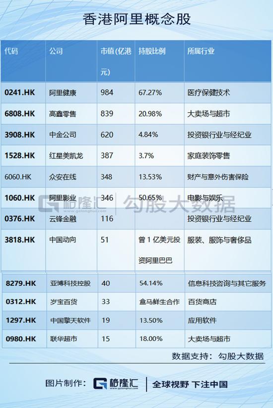 港股上市的阿里概念股有11家,涉及医疗保健到大卖场等各个行业。其中,阿里巴巴直接控股的有阿里健康(8, -0.13, -1.60%)、阿里影业(1.31,-0.01, -0.76%)、亚博科技控股(0.35, 0.00, 0.00%),其余的主要是参股与业务合作的方式进行合作。
