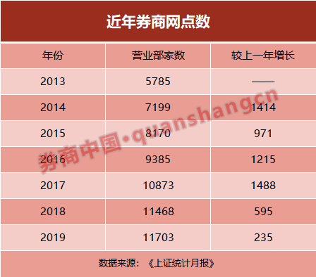 自2013年监管机构开放网点新设以来,行业网点数量倍增。上交所的统计数据显示,2013年末券商网点数量共5785家,此后一直加速增长。至2019年末,券商营业网点数量达到了11703家,比2013年增长了102%。