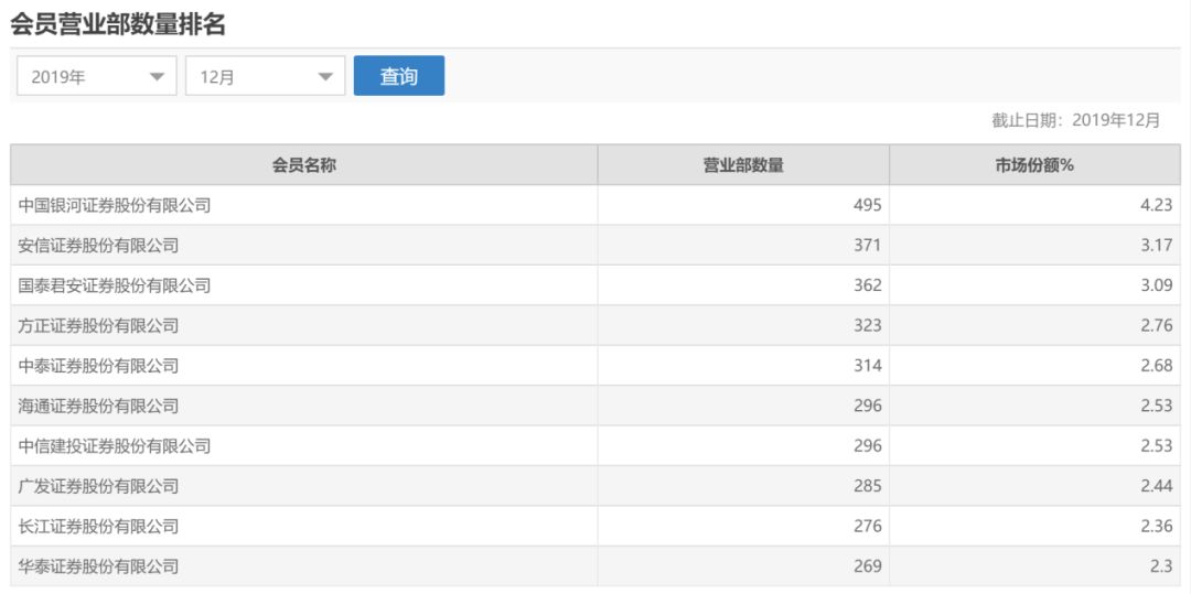 按照上交所的统计数据,截至2019年末,国泰君安证券共有362家营业部(其中包括18家开通经纪业务席位分公司),营业部数量排名行业第三,仅次于中国银河(11.170, -0.02, -0.18%)证券和安信证券。