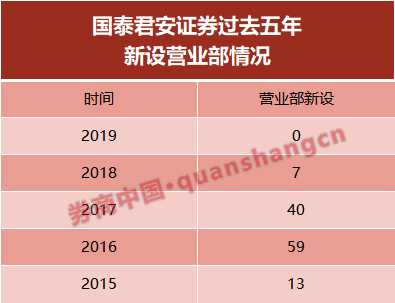 国泰君安证券分支机构新设情况显示,2016年、2017年两年,国泰君安证券分别新设了59家、40家营业部,但在2018年仅新设了7家营业部,2019年相比2018年没有新增。