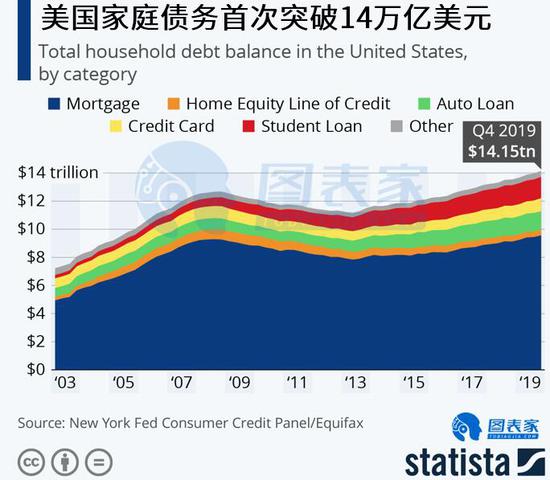 根据纽约联储的报告,家庭债务在2019年激增,创下金融危机爆发前以来的最大年度增幅。