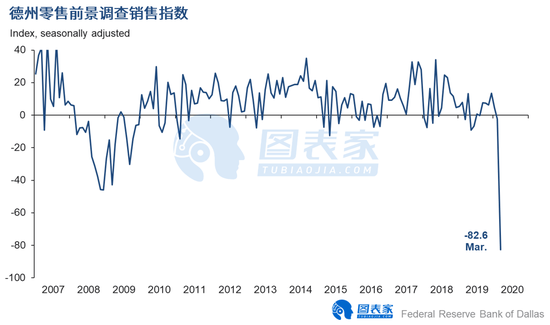 零售商遭受重创。德州零售前景调查的零售销售指数从2月的-2.5降至3月的历史最低值-82.6。整体商业活动指数也从-5.0降至历史最低值-84.2。