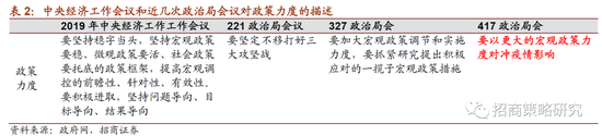到了221政治局会议虽然受到疫情的影响,但是对政策的力度并没有做加码的表述。但是到了“327”政治局会议。明确提出“要加大宏观政策调节和实施力度,要抓紧研究提出积极应对的一揽子宏观政策措施”,在“417”政治局里面这个“加大”换成了“更大”也凸显的力度要进一步加码。