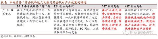 2019年年底的中央经济工作会议,对于产业政策表述是非常完整的,各个领域都会提到,而在221政治局会议随着疫情的爆发,这个时候政府的政策也没有特别提到要进行大规模的扩张,比如表述是促进消费回补和潜力释放,而在产业领域提到的都是一些新投资、医药新兴产业等等。