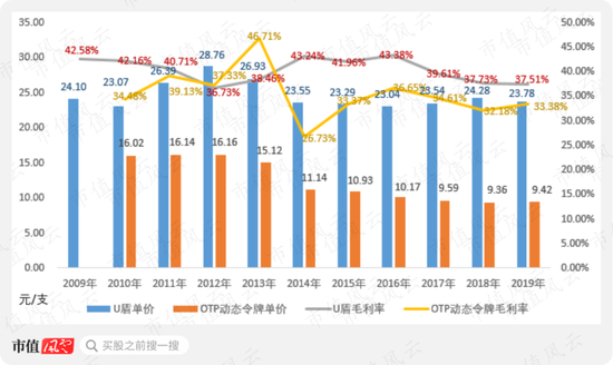 从单价变动更能看出竞争的激烈程度。2014年上市当年,U盾和OTP单价均下了一个台阶。如下图: