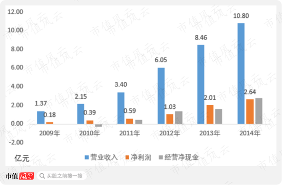 这5年间,U盾和OTP动态令牌每年合计收入贡献都在90%左右,核心业务营收高速增长,有了下图这么完美的增长曲线,2014年成功上市也顺理成章。