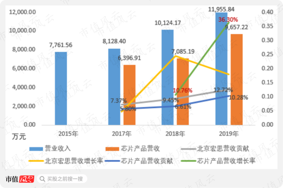 宏思电子芯片业务2019年增长36.30%,营收规模接近亿元,势头较猛。