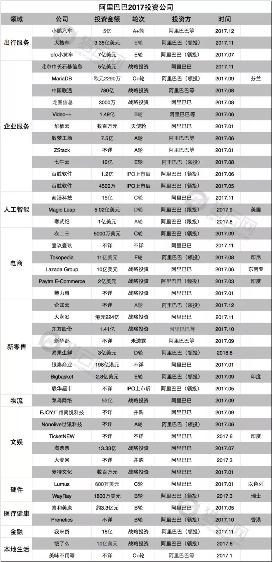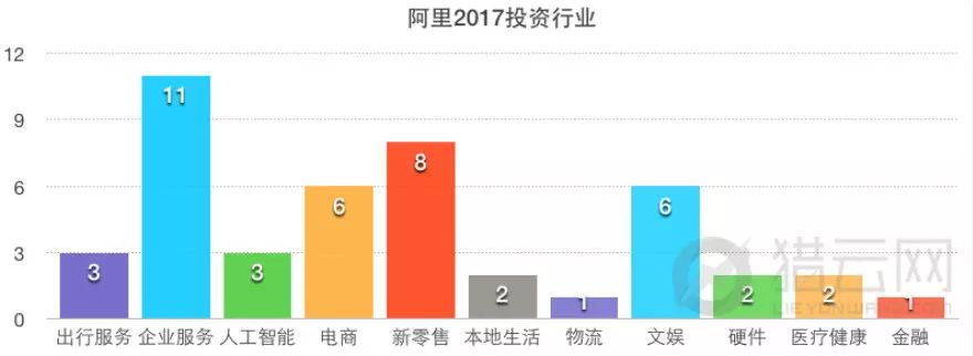 新零售、人工智能和企服占了阿里2017年大部分投资比例,这和阿里巴巴的战略和定调相一致。