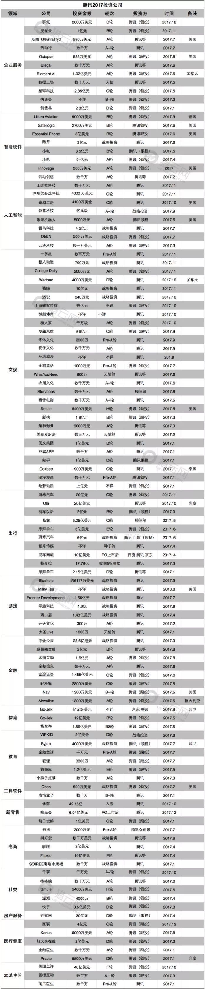 以下是腾讯、阿里和百度2017年投资公司的详细情况: