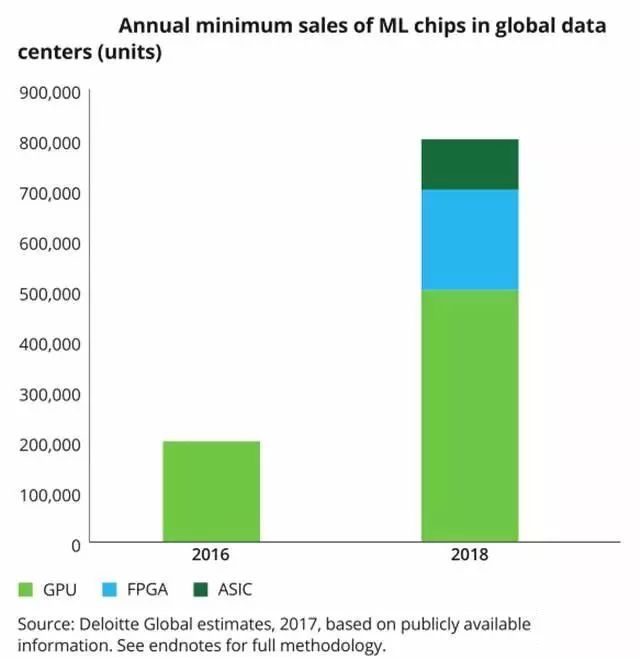 德勤预测,到2018年末,被用作机器学习(ML)加速器的数据中心芯片中,GPU和CPU仍占大头,约有25%会是FPGA或者ASIC,以追求灵活性、更低的能耗以及更高的效益。而这一市场,从2016年的数据来看,是基本完全被GPU垄断的。