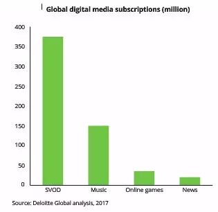 德勤预计到 2018 年底,50%发达国家的成年人会订阅至少两种仅提供线上的媒体服务,而到2020 年将上升到 4 种。2018年,用户每月订阅电视频道、电影、音乐、新闻以及杂志每项的平均费用低于十美元。预计今年年底有 6.8 亿美元的订阅量,大约 3.5 亿订阅用户。