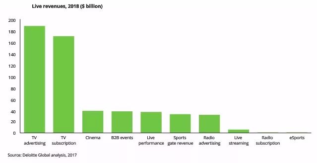 德勤全球预计,2018 年全球现场直播行业将产生 5,450 亿美元的直接收入,传统渠道将贡献98.5%的收入,剩余收入来自网络直播和电竞直播。在网络和电子时代,直播变得更有吸引力,同时也能产生更大的回报,直播行业将保持蓬勃的态势。(在本文中,直播行业是指广义的直播,包括电视直播、电台直播、网络直播、线下大型活动等。)