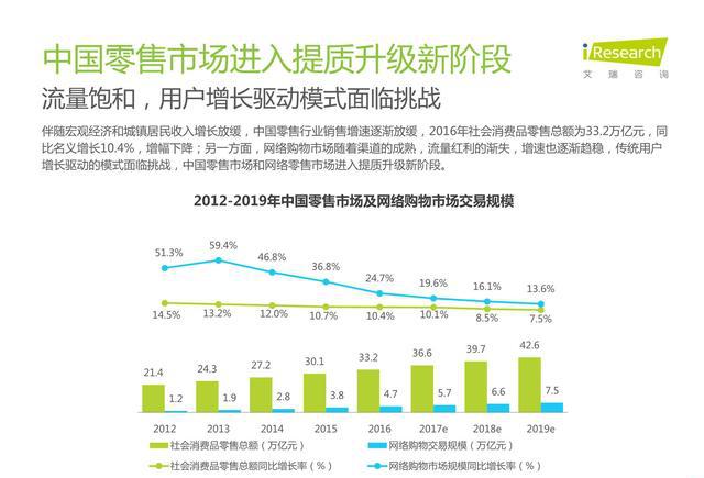 网络购物市场随着渠道的成熟,流量红利的渐失,增速也逐渐趋稳,传统用户增长驱动的模式面临挑战,中国零售市场和网络零售市场进入提质升级新阶段。主要体现在: