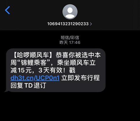 而在滴滴顺风车北京上线的前一天,新浪科技还收到了哈啰顺风车的促销短信,给出了乘坐顺风车立减15元的优惠,以补贴来争夺用户。