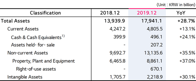 到了2019年底,LG U+总资产膨胀近4万亿韩元,逼近18万亿韩元,涨幅近29%。其中,固定资产增幅超35%,“物业、厂房、设备”(下称:PP&E)一类固定资产的增幅超过37%。
