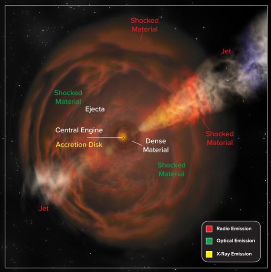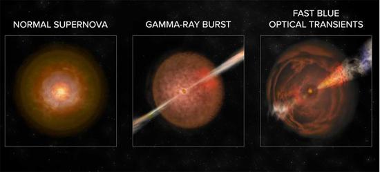 天文学家们近日发现了两个新天体,这来个天体是2018年发现的奇特天体的补充,它们结合在一起构成了一类新的宇宙爆炸。这类新型爆炸与大质量恒星的超新星爆炸和产生伽马射线爆发的爆炸有一些共同的特征。尽管有相似之处,但这种新的爆炸类别与其他类别的爆炸有着明显的区别。 2018年6月,天文学家首次观测到了一个具有惊人特征和行为的宇宙爆炸。该天体被称为AT2018cow,或被昵称为“奶牛”(The Cow)。由于该天体与超新星爆炸具有一些共同的属性,但在一些关键特征上又有所不同,因此“奶牛”引起了全世界科学家的关注,并被广泛研究。这两个新的爆炸是CSS161010和ZTF18abvkwla或 “考拉”(The Koala)。第一个是在2016年被发现的,距离地球约5亿光年。 另一个是在2018年发现的,距离地球34亿光年。这两个天体都是通过使用类似可见光的望远镜扫描大面积夜空的自动天体勘测发现的。研究 “考拉”的科学家们注意到,该天体的射电波发射量与伽马射线暴的射电波发射量相当。调查CSS161010的研究人员说,它以超过光速一半以上的速度向星际空间喷出了“令人意想不到的”物质。 在这两种情况下,后续观测表明,这两个天体与“奶牛”有着共同的特征。科学家们得出的结论是,这些事件被称为“快速蓝色光学瞬态”(FBOTs),代表了一种明显不同于其他类型的恒星爆炸。快速蓝光瞬态的开始方式与某些超新星和伽马射线爆发的开始方式相同,差异表现出来的地方是在最初的爆炸之后。