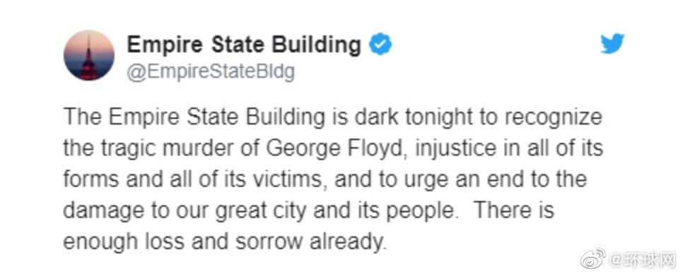 #纽约帝国大厦熄灯#【纽约帝国大厦今晚熄灯:纪念弗洛伊德的“悲剧性谋杀”及“一切形式的不公正”】刚刚,纽约帝国大厦在其官方推特账号上发布消息称,帝国大厦今晚(当地时间6月1日晚)熄灯,以回应乔治·弗洛伊德被“悲剧性谋杀”,以及“一切形式的不公正及其所有的受害者”。 推文还写道,“还为了呼吁结束那些对我们伟大城市和人民的伤害。损失和悲伤已经足够多了。” 早前一天(5月31日),华盛顿特区实施宵禁,但白宫附近多处地点遭示威者纵火,地标建筑、被称为“总统的教堂”的圣约翰教堂也被放火。面对白宫外聚集抗议的示威者,白宫却熄灭了其标志性灯光,陷入一片黑暗之中。