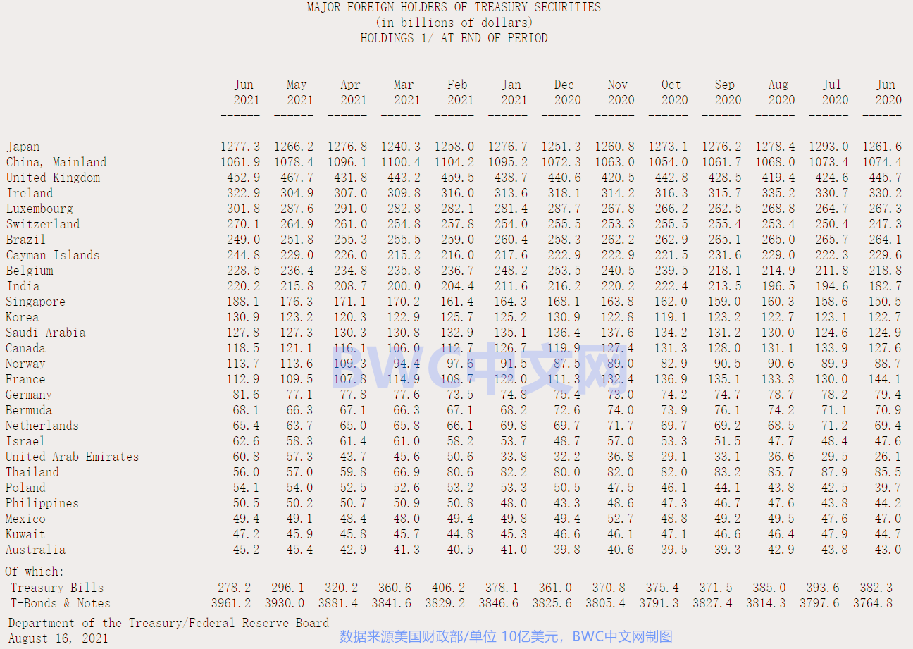 据美国财政部 最新公布的国际资本流动报告显示(美债官方数据报告会有两个月的延迟),中国在6月所持美债仓位出现连续四个月下降,总持有量降至1.062万亿美元,创下2020年10月来新低,数据显示,在2021年3至6月分别减持了38亿,43亿、177亿和165亿美元的美债(详细数据请参考下图细节)。