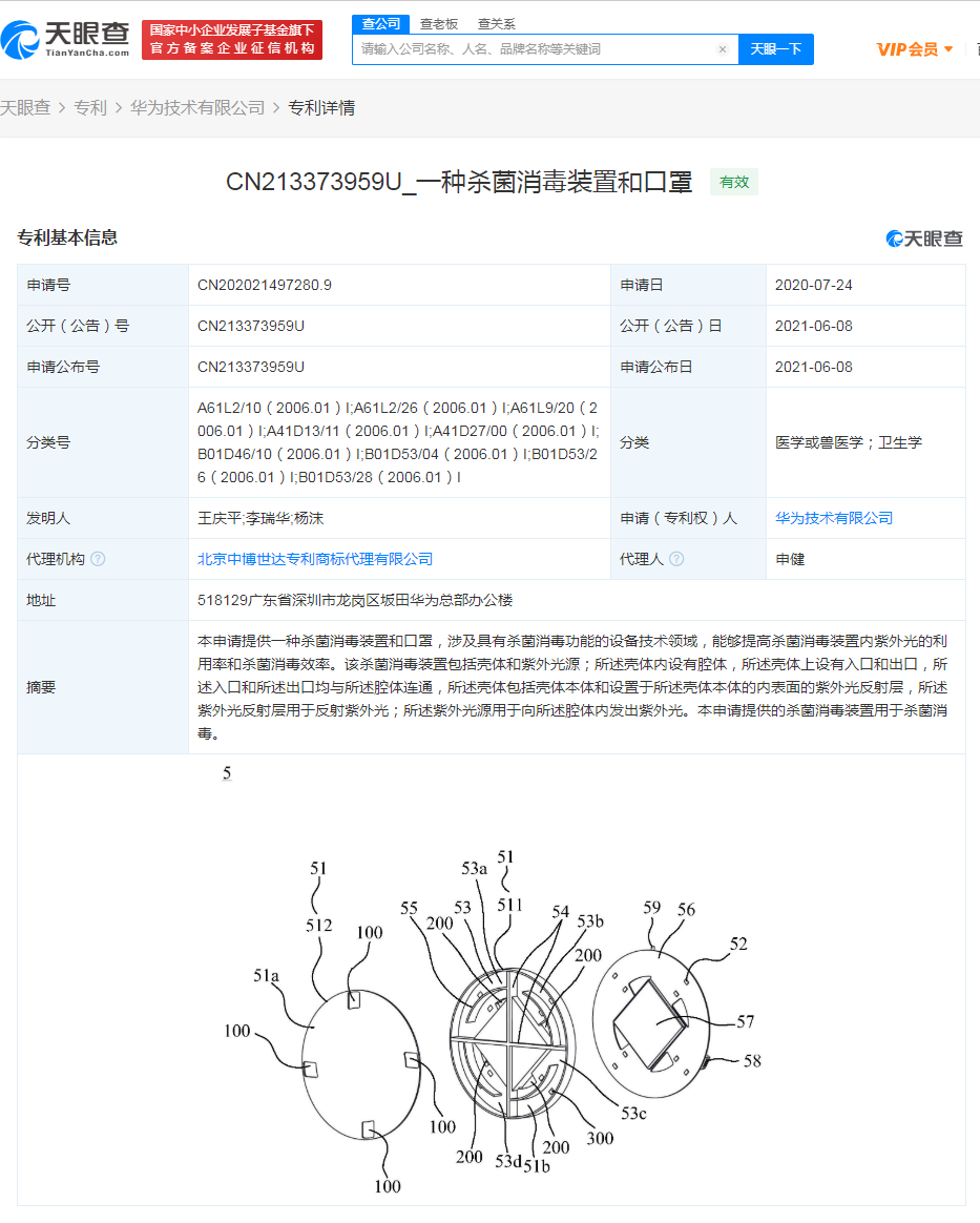 中国经济周刊-经济网讯 天眼查APP显示,近日,华为技术有限公司获得“一种杀菌消毒装置和口罩”专利授权,公告号为CN213373959U,申请日期为2020年7月。专利摘要显示,该杀菌消毒装置包括壳体和紫外光源,涉及具有杀菌消毒功能的设备技术领域,能够提高杀菌消毒装置内紫外光的利用率和杀菌消毒效率