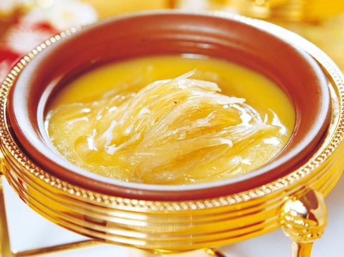六、三丝鱼翅 这道菜主要以鱼翅为主,另外搭配海参、鸡腿、冬笋,营养价值高,脂肪含量少,干鱼翅在这道菜中,起到了重要的作用,丰富的胶原蛋白,与鸡腿相辅相成,达到了蛋白质互补的效果,滋养身体,柔顺皮肤,冬笋质嫩味鲜,清脆爽口,一般人群均可食用。