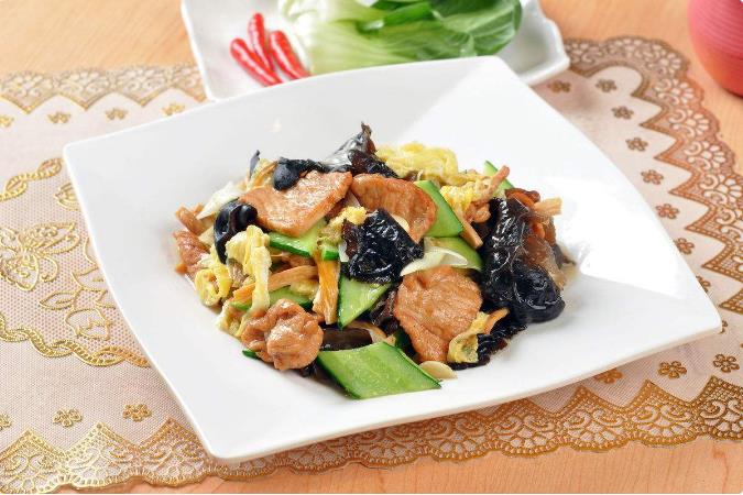 十、木须肉 木须肉也叫苜蓿肉,由猪肉片、鸡蛋、黄瓜和黑木耳混炒组成,营养丰富,口感鲜香,老少皆宜,这样的荤素搭配组合,适合大部分人群,肉质滑嫩,黄瓜清脆。