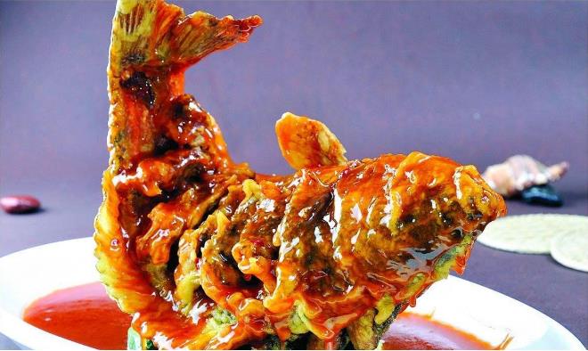 三、糖醋鲤鱼 山东济南的传统名菜,属于鲁菜系,所采用的的食材鲤鱼,就是野生的黄河大鲤鱼,单从食材来讲,野生的比养殖的要好吃,口感不同,黄河大鲤鱼生活在黄河深处,肉质肥嫩,全身鳞亮,很多人甚至都没见过,大师傅在制作这道菜时,先用刀划出口,裹上一层淀粉糊,下油锅炸熟,淋入糖醋汁,外面的脆的,鱼肉很嫩,汤汁酸甜可口。