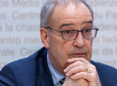 瑞士经济部长居伊・帕尔梅林(GuyParmelin)在播出的瑞士德...