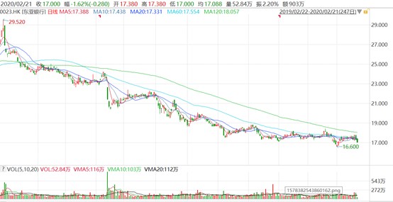 受到净利润腰斩和去年支出剧增等业绩不利因素,2月20日,东亚银行开盘小幅冲高后随即一路走低,大跌2.59%,领跌恒指成分股。而至2月21日,情况依然未能有所好转,开盘后未能迎来反弹,而是再度进一步走低,截至午间休市时下挫1.62%,报17港元。