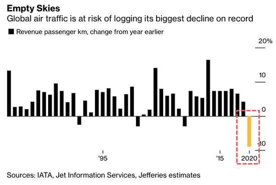 根据投行杰富瑞(Jefferies)的一份新报告,新冠病毒疫情的扩散已成为全球航空旅游业的一大难题。事实上,这将成为有史以来全球航空业遭受的最大冲击。由于全球病毒大流行导致全球各地的运输线路瘫痪,预计今年全球航空客运量将下降8.9%。