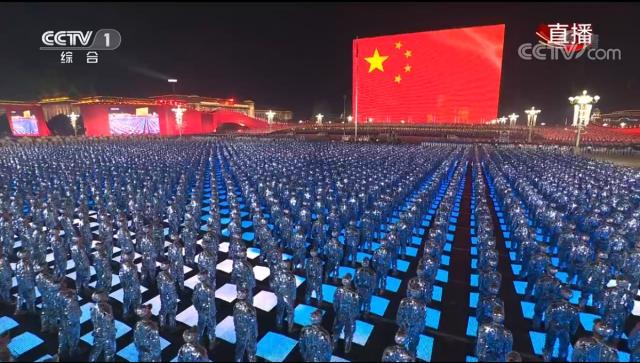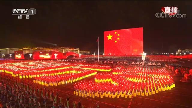 “美丽的蓝天上,五星红旗飘扬……”舒展优美的《红旗颂》在广场上空飘荡,千人合唱团唱集体侧身转向身后,一面广场上最大的“五星红旗”升起,瞬间点亮广场所有人的目光。