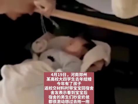 河南郑州,某大学一大四男生返校抱着宝宝回宿舍,忙坏了宿舍这群“干爸爸”,争着抢着去逗。据介绍,男生去年结婚,舍友们还去当了伴郎,今年就有了一个小孩,临近毕业来学校就抱回宿舍让舍友们看看,大家看到小孩后特别惊讶,都想过去抱抱,十分羡慕。
