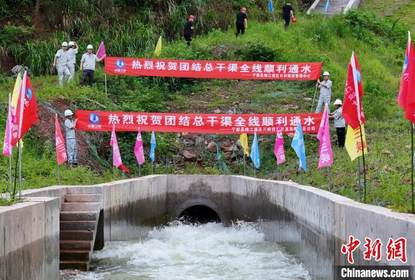 随着团结水库1号副坝出水口闸门缓缓打开,汩汩清水顺着渠道...
