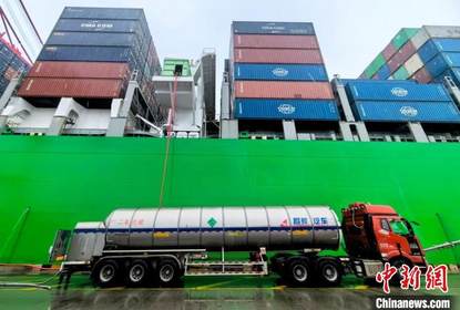 巴拿马籍“长顶”号集装箱货轮完成作业后驶离上海洋山深水港一...